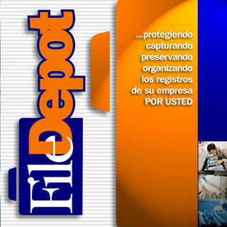Diseno de logotipo y portada folleto informativo de File Depot, cia de almacenaje de archivos.